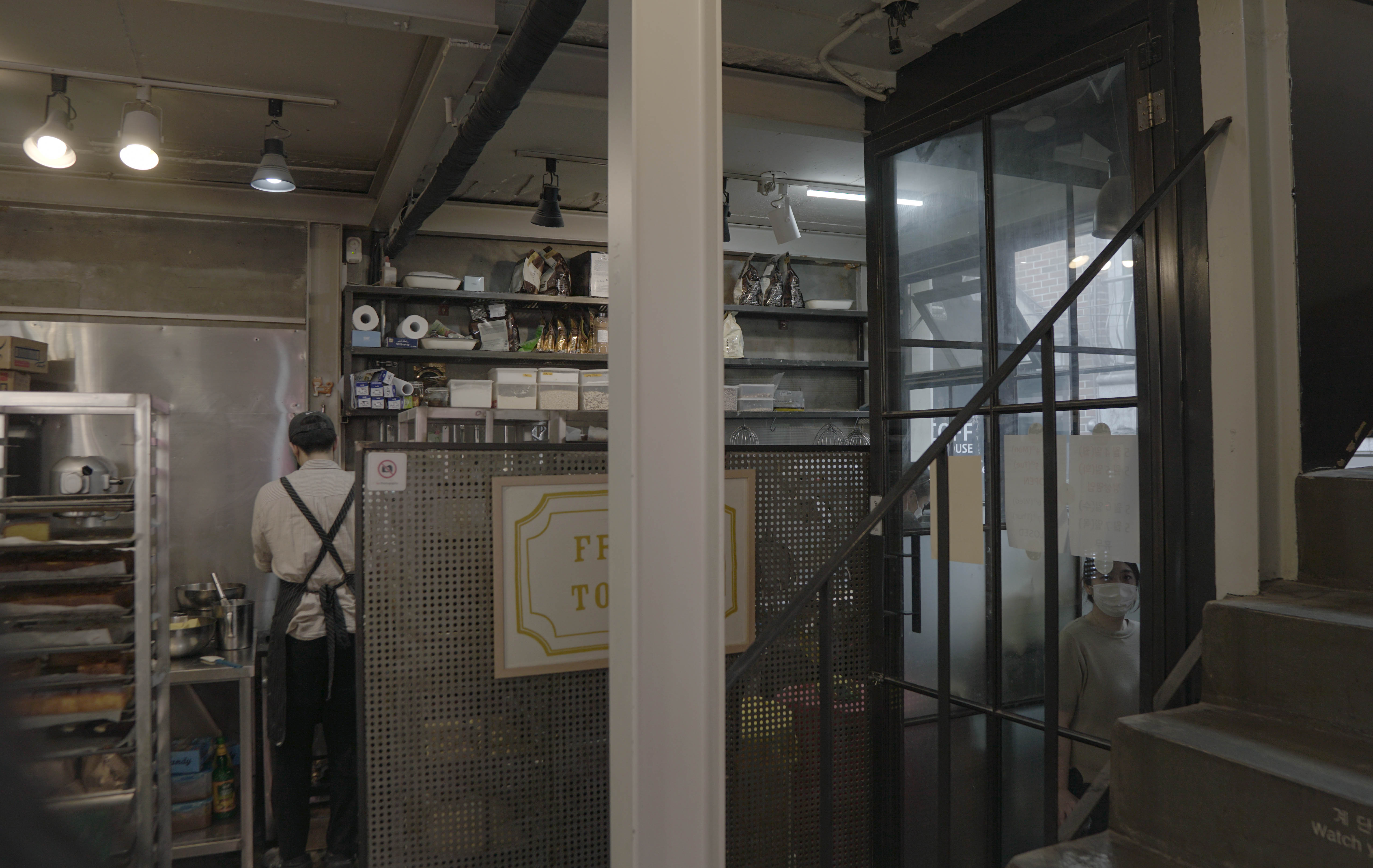 기존 방문객들이 소진한 빵들을 계속해서 구워내고 채워낸다. 빵을 굽는 베이커들의 움직임이 공간을 가득 채운다.